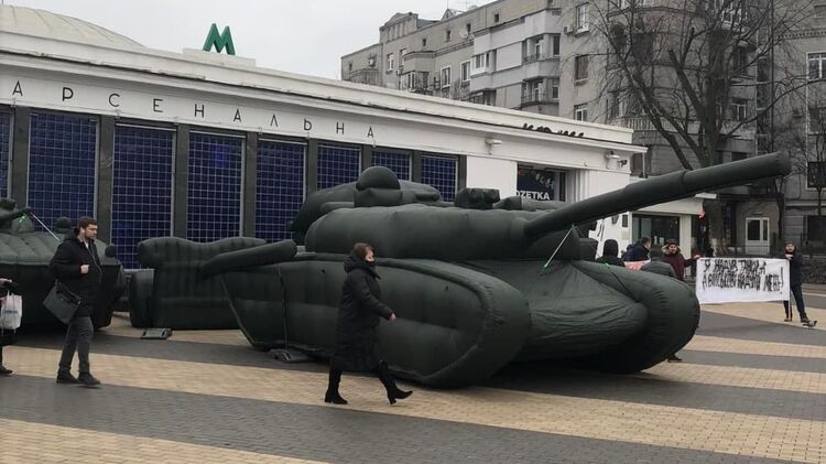 Надувной танк у метро Арсенальная. Скриншот из фейсбука