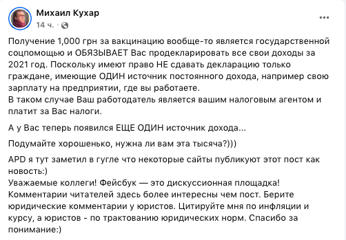 "Получение 1000 грн за вакцинацию вообще-то является государственной соцпомощью и обязывает Вас продекларировать все свои доходы за 2021 год. Поскольку имеют право не сдавать декларацию только граждане, имеющие один источник постоянного дохода, например свою зарплату на предприятии, где вы работаете.