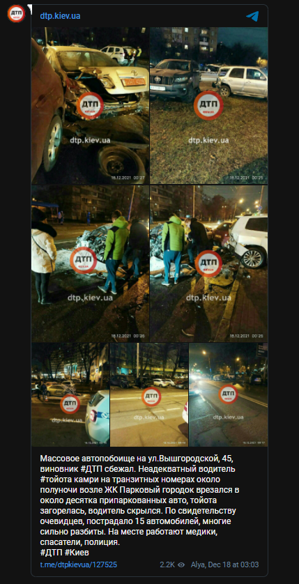 В ночь на субботу, 18 декабря, в Оболонском районе Киева легковой автомобиль Toyota Camry столкнулся с более десятью припаркованными у дороги авто и загорелось. При этом водитель с места происшествия скрылся.