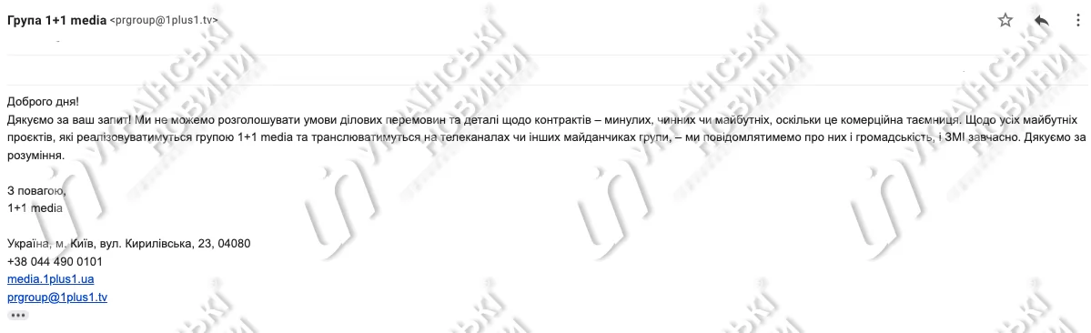 "Мы не можем разглашать условия деловых переговоров и детали контрактов - прошлых, действующих или будущих, поскольку это коммерческая тайна. Что касается всех будущих проектов, которые будут реализовываться группой "1+1 media" и будут транслироваться на телеканалах или других площадках группы, мы будем уведомлять о них и общественность, и СМИ заблаговременно", - указывается в ответе.