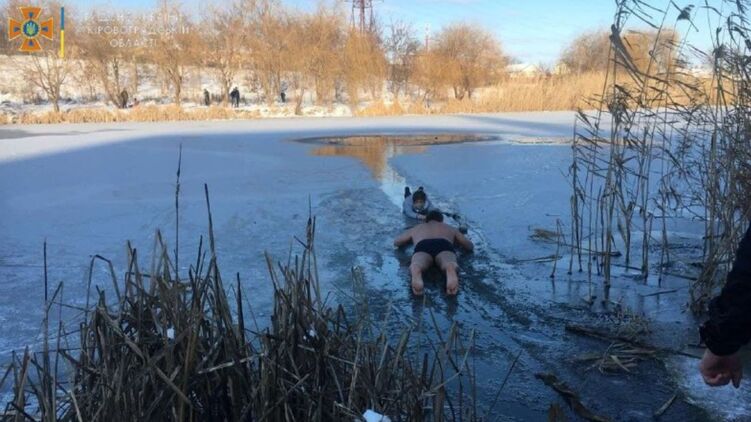 Мужчина пополз к ребенку по льду. Фото: kr.dsns.gov.ua