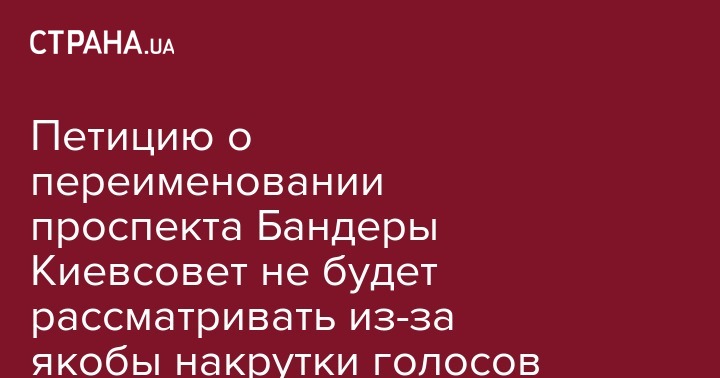 В Киевской мэрии сообщили о невозможности рассмотрения петиции №4094, в которой авторы призывали дать проспекту Степана Бандеры более нейтральное название, из-за якобы выявленных фактов фальсификации, а именно накрутки голосов. Об этом сообщает пресс-служба КГГА.