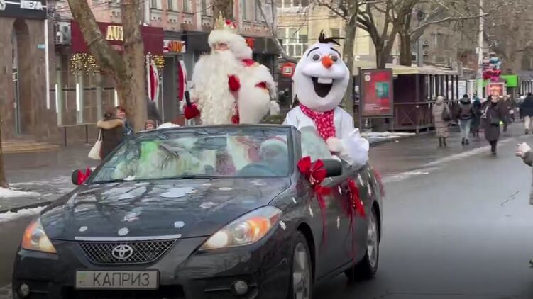По улице Соборной, которая является исключительно пешеходной, ездит украшенный к Новому году автомобиль Toyota с номерами "КАПРИЗ". Примечательно, что в салоне авто, помимо водителя и пассажира, на заднем сиденье расположились Дед Мороз и Снеговик. Благодаря откидному верху они стоят и машут всем прохожим.