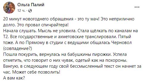 Вангую, в следующем году свой бессмысленный текст он начнет за час. Может себе позволить! А вам как?" - прокомментировала речь журналист Ольга Палий.