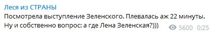 "Посмотрела выступление Зеленского. Плевалась аж 22 минуты. Ну и собственно вопрос: а где Лена Зеленская?" - написала журналист "Страны", ведущая блога "Ясно-Понятно" Олеся Медведева.