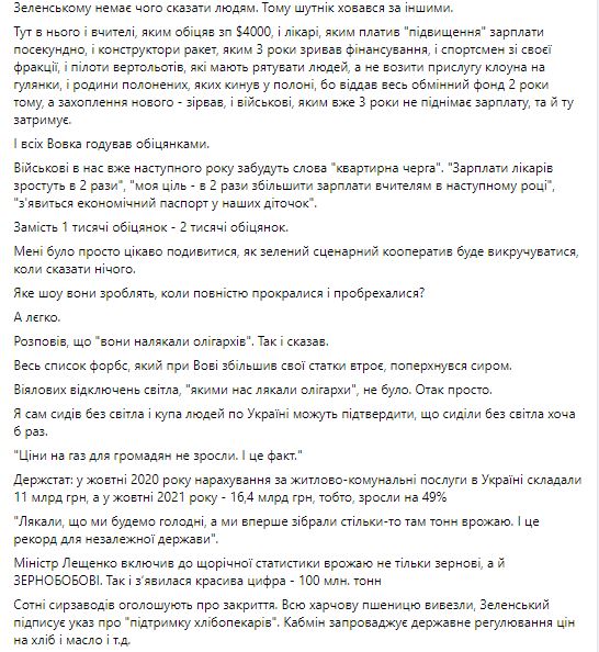 "Зеленскому нечего сказать людям. Поэтому шутник скрывался за другими. Здесь у него и учителя, которым обещал $4000, и врачи, которым платил "повышение" зарплаты посекундно, и конструкторы ракет, которым 3 года срывал финансирование, и спортсмен из своей фракции, и пилоты вертолетов, которые должны спасать людей, а не возить прислугу клоуна на пирушки, и семьи пленных, которых бросил в плену, потому что отдал весь обменный фонд 2 года назад, а захват нового – сорвал, и военные, которым уже 3 года не поднимает зарплату, и ту задерживает.