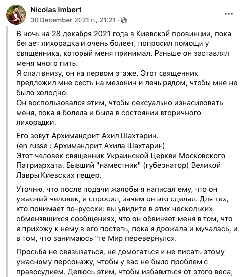 На своей странице в Facebook он написал, что развратные действия в отношении него якобы совершил священнослужитель УПЦ, архимандрит Ахила Шахтарин, у которого дома он ночевал на прошлой неделе.