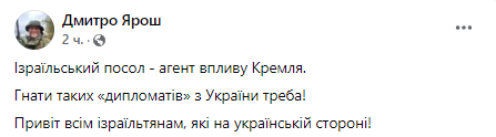 "Израильский посол – агент влияния Кремля. Гнать таких "дипломатов" из Украины нужно! Привет, всем израильтянам, которые на украинской стороне!", - написал он.