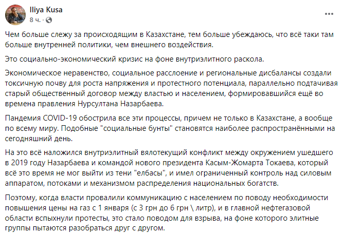 "Это социально-экономический кризис на фоне внутриэлитного раскола", - пишет политолог-международник Илья Куса.