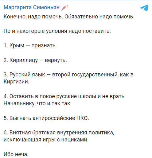 6. Внятная братская внутренняя политика, исключающая игры с нациками", - пишет главный редактор телеканала RT Маргарита Симоньян.