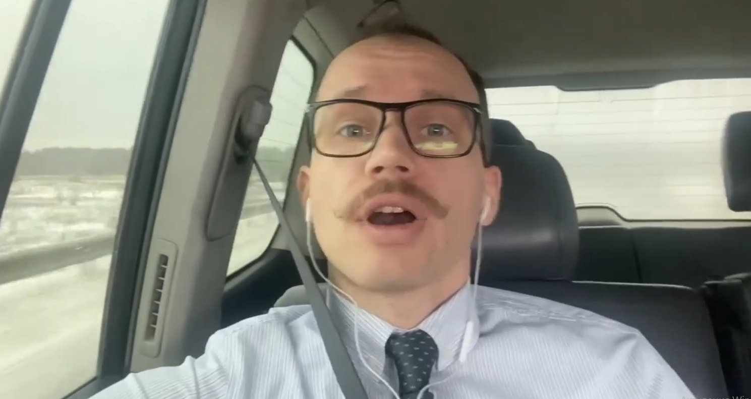На видео министр едет в автомобиле и рассказывает о том, что попробовал себя "в шкуре обычного работника Минюста" и поработал немного в ЗАГСе. На кадрах крупным планом снято лицо Малюськи, на котором видны его усы.