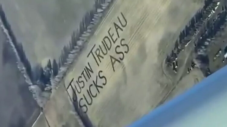 В знак протеста и общей неприязни к премьер-министру страны Джастину Трюдо протестующие фермеры написали на своих полях нецензурное выражение в его адрес: "Justin Trudeau suck$ @ss" (можно перевести как "Джастин Трюдо целует задницу" - Ред.).