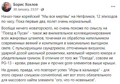 "Начал-таки корейский "Мы все мертвы" на Нетфликсе, 12 эпизодов по часу. Пока первые два, полет очень нормальный.