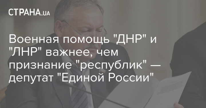 Заместитель председателя комитета Госдумы РФ по делам СНГ Константин Затулин считает, что предложение правящей партии РФ "Единая Россия" о поставках военной помощи в "ЛДНР" сейчас актуальнее, чем проект о признании Россией суверенитета "республик". Поставки оружия в "ЛДНР", по его мнению, не станут нарушением "минских соглашений".