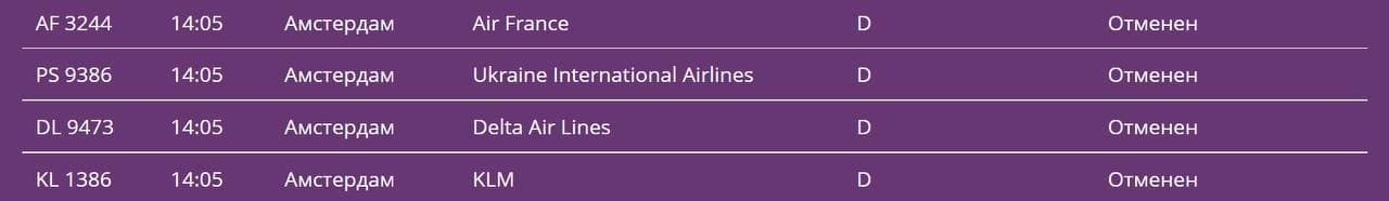 Кроме того, были отменены и вылеты компании KLM из "Борисполя".