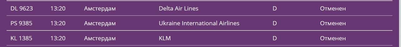 Так, в Киеве в аэропорту "Борисполь" отменили прибытие рейса компании KLM (а также квота мест на нем других авиакомпаний).