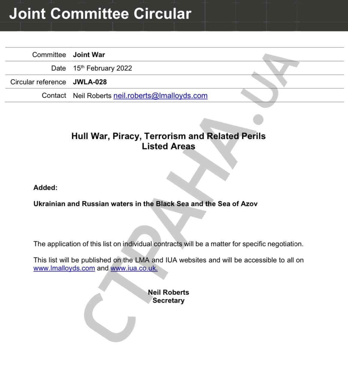 В уведомлении о присвоении такого статуса акватории Черного и Азовского морей указаны контакты Нила Робертса, главы направления морского и авиастрахования, который еще вчера раздавал комментарии СМИ по поводу намерений страховщиков снять гарантии с самолетов, летающих в Украину.