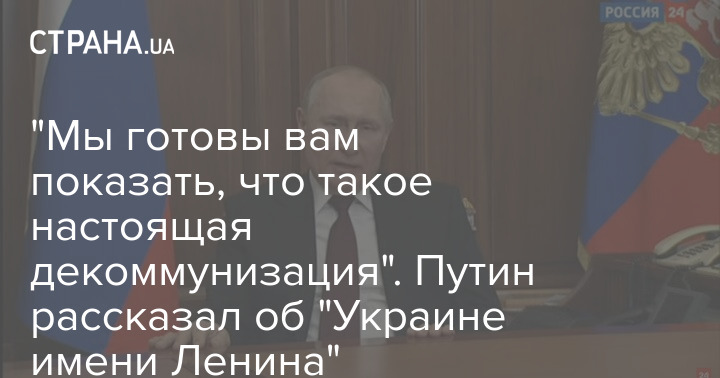 "Таким образом, усилиями большевиков и была создана Украина. Ее так и можно назвать: Украина имени Ленина, который силой туда запихнул Донбасс. И теперь там свергают памятники Ленину и проводят декоммунизацию. Вы хотите декоммунизацию? Нас это вполне устраивает. Мы готовы вам показать, что такое настоящая декоммунизация", - заявил Путин.