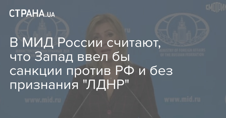 Официальный представитель Министерства иностранных дел России Мария Захарова считает, что предположения о том, что Запад не ввел бы санкций против РФ, если бы не было признания "ЛДНР", являются иллюзией.