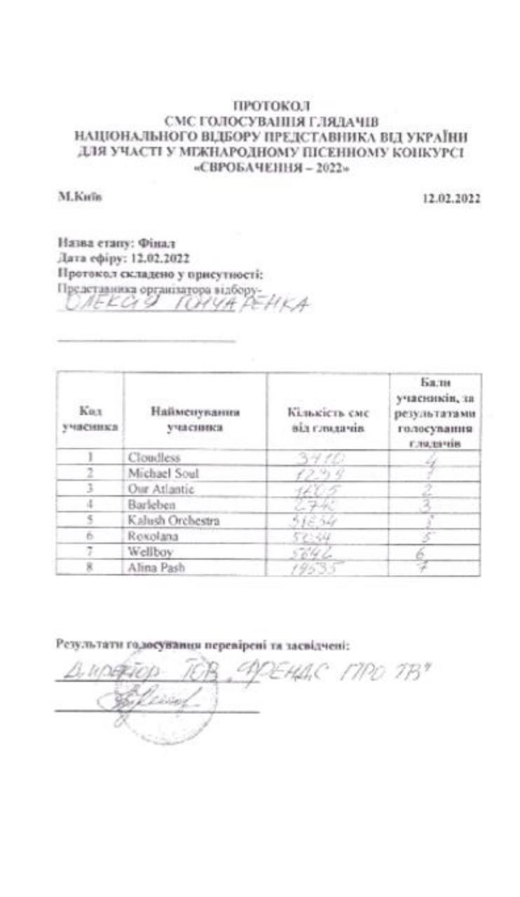 Группа Kalush Orchestra требовала показать им протокол с баллами от зрительского голосования. Однако аудиторская компания, которая проводила подсчёты, отказывалась это сделать, как и "Общественное". Но теперь, когда протокол появился в Сети, видно, что баллы финалистов были оглашены и распределены правильно.