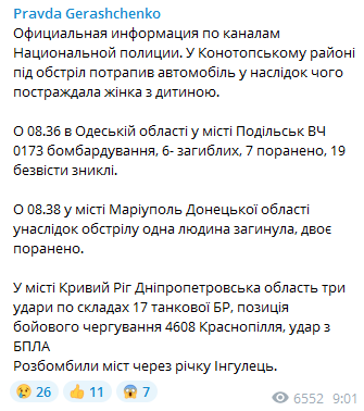 Также Геращенко сообщает, что в 08:36 в Одесской области в городе Подольск в результате бомбардировки воинской части №0173 6 человек погибли, 7 - были ранены, 19 - пропали без вести.