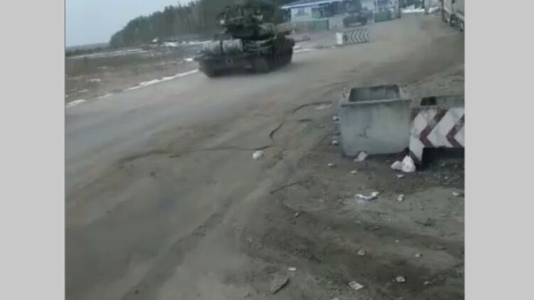 В Сети опубликовано видео, как российские танки заходят в Черниговскую область через белорусский пункт пропуска. Видео снято несколько часов назад.