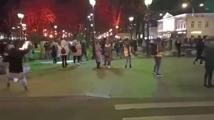 Одна из девушек из толпы бросила что-то вроде коктейля Молотова в полицейского на митинге против войны в Москве.