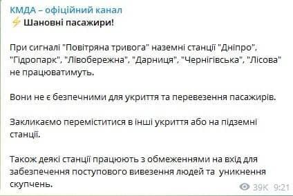 09:27 Объявление для киевлян: при сигнале "Воздушная тревога" наземные станции "Днепр", "Гидропарк", "Левобережная", "Дарница", "Черниговская", "Лесная" не будут работать.