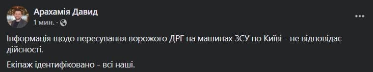 09:48 А вот "слуга  народа" Давид Арахамия заявил, что передвижения вражеской ДРГ на машинах ВСУ в Киеве - это фейк, а военные оказались украинцами.