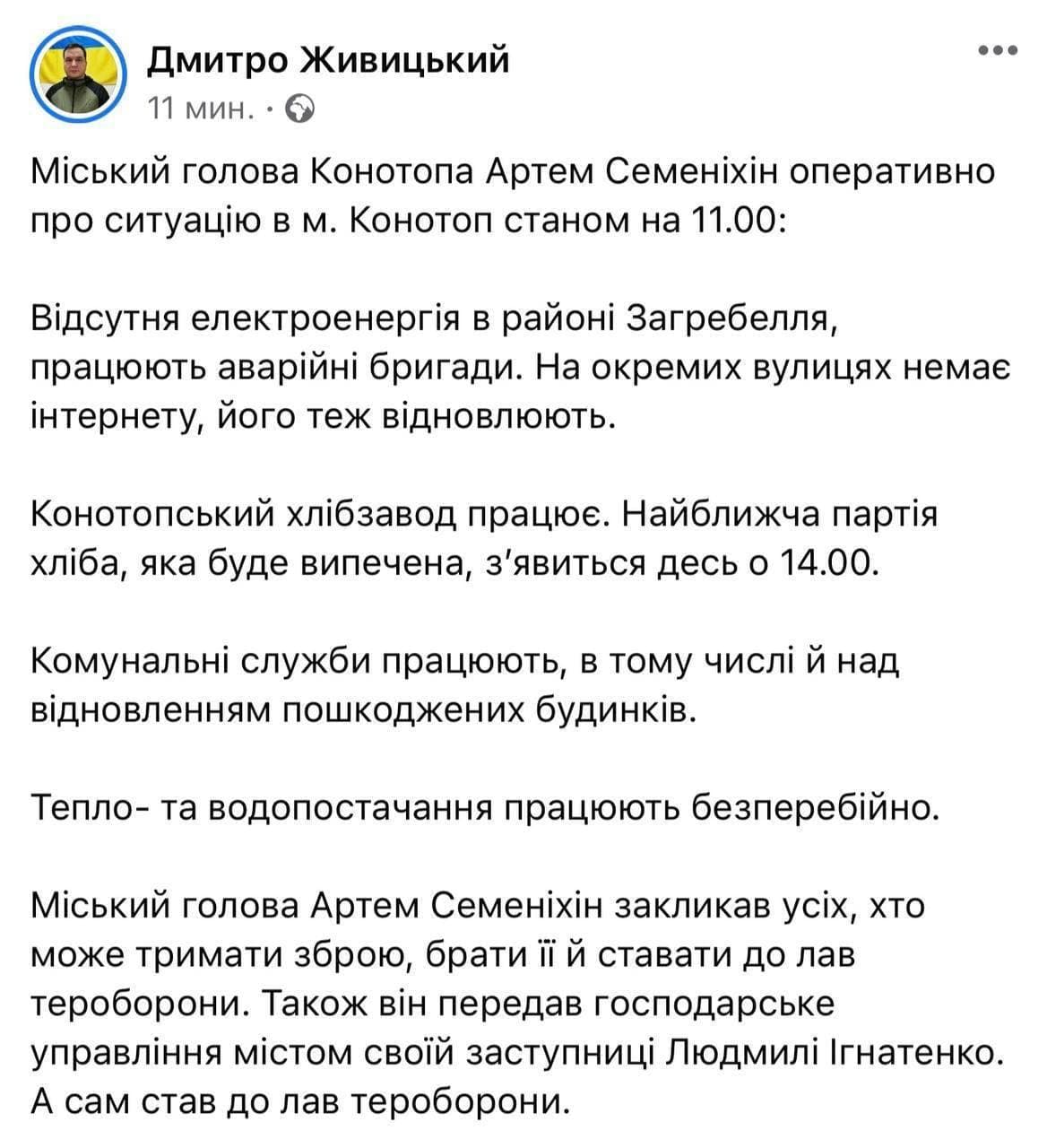 07:58  МВД Украины подтверждает, что Конотоп окружен российскими войсками, в Сумах идут уличные бои.