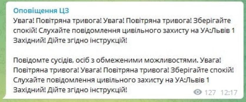07:20  В Киеве и Львове включили сирены противовоздушной тревоги и говорят, что это не учебная, а боевая тревога.