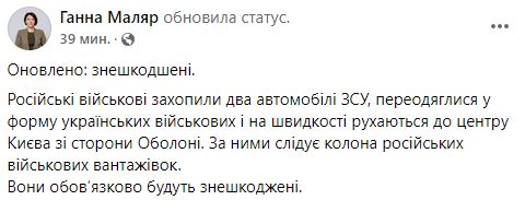 09:00  Заместитель министра обороны Украины Анна Маляр пишет, что российские военные захватили несколько автомобилей ВСУ и движутся на Киев.