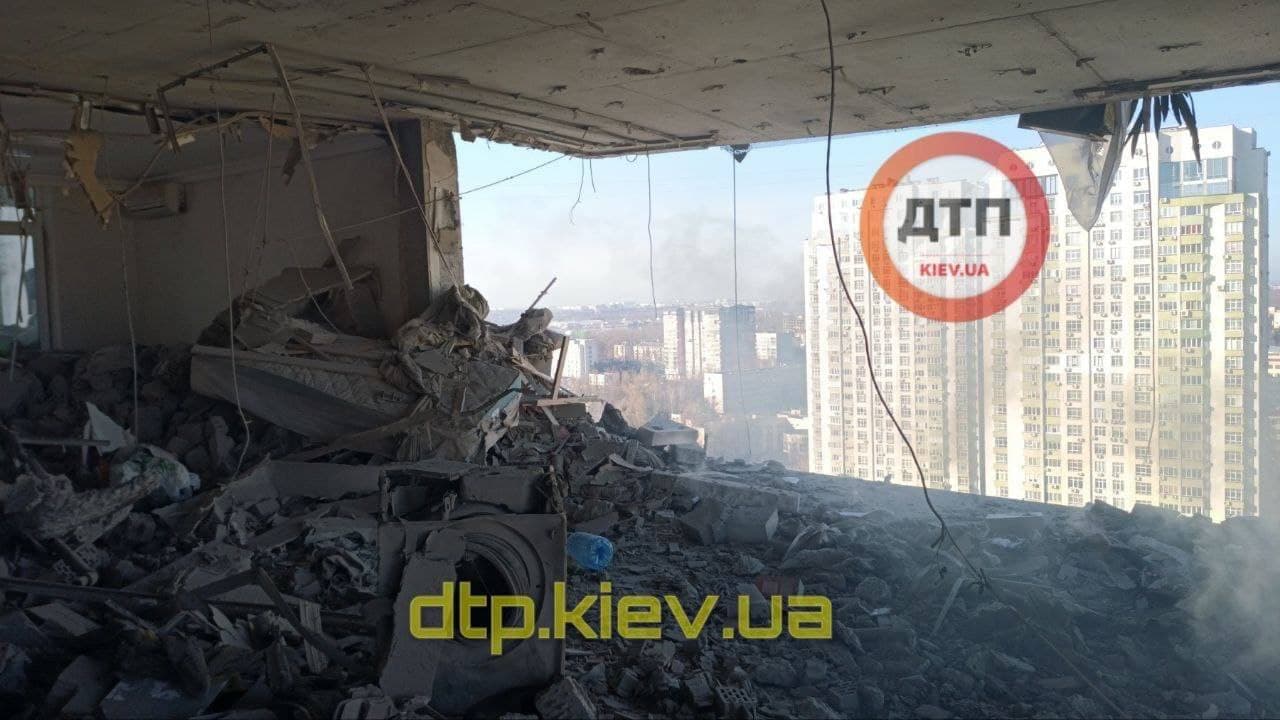 Видео последствий того, как в дом на улице Кошица в Киеве попала то ли ракета, то ли ее обломки после удачного выстрела украинской ПВО.