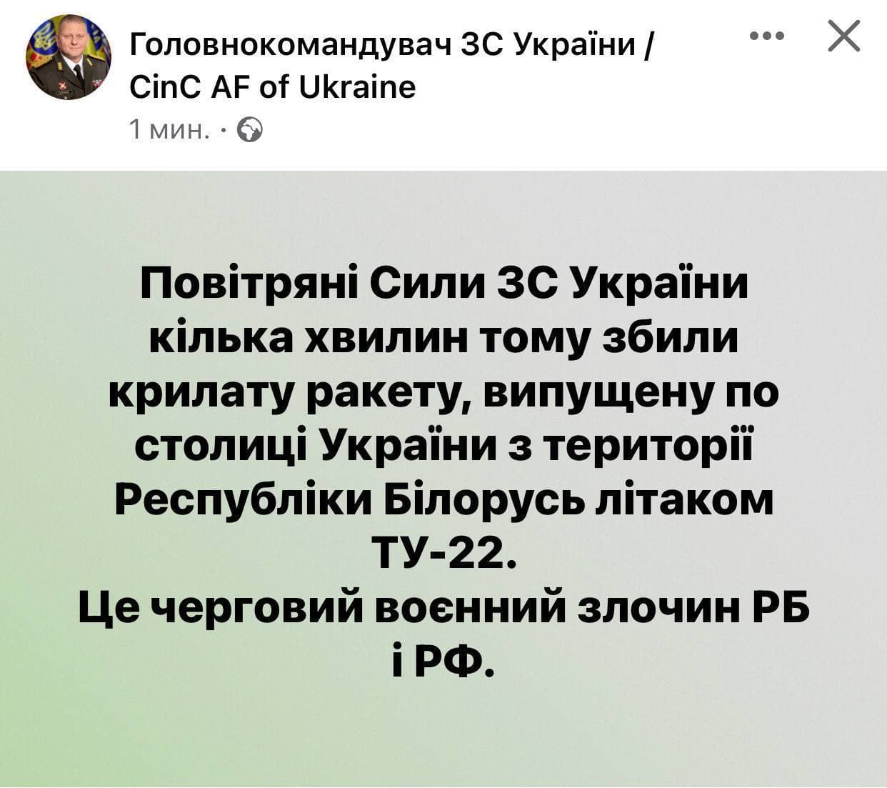 12:10 Губернатор Волынской области сообщил, что по воинской части около города Владимир нанесён ракетный удар из Беларуси.