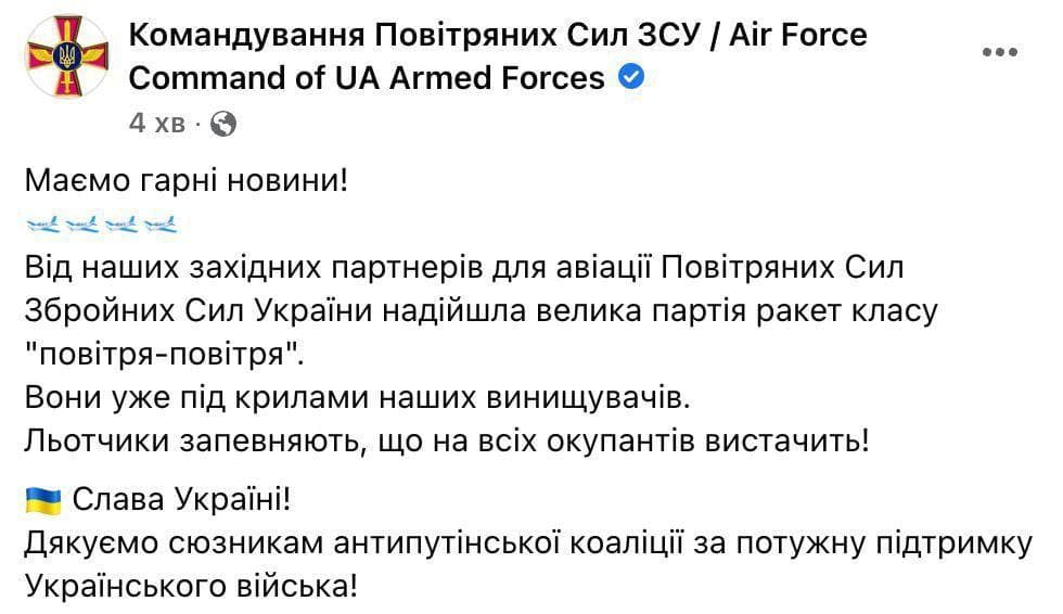 12:08 ВВС Украины объявили о получении крупной партии ракет класса воздух-воздух от западных партнеров.