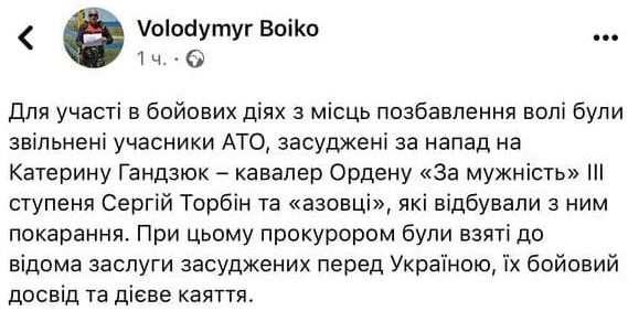 • осужденный за организацию нападения на херсонскую активистку Екатерину Гандзюк Сергей Торбин. Ему разрешили взять в подразделение еще десяток человек, которых он также выбрал из осужденных