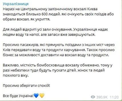 12:40 На ж/д вокзале в Киеве заканчиваются запасы воды и еды. Там находится 600 человек.