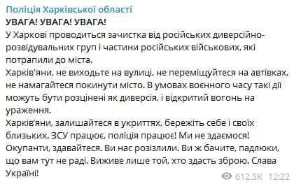 12:45 Харьковская полиция просит горожан не выходит на улицу и не пытаться покинуть город. Призывают всех сидеть дома.