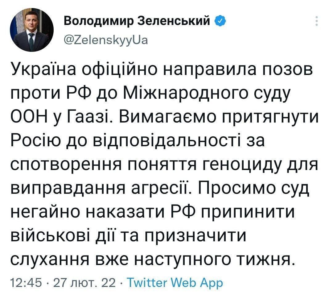 12:52 Украина официально подала обращение в Гаагский трибунал по поводу нападения России.