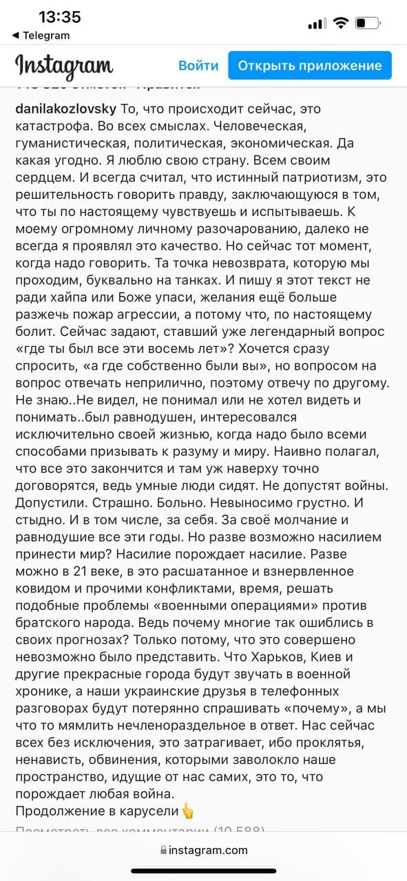 14:37 Популярный российский актёр Данила Козловский призвал Путина остановить войну в Украине.