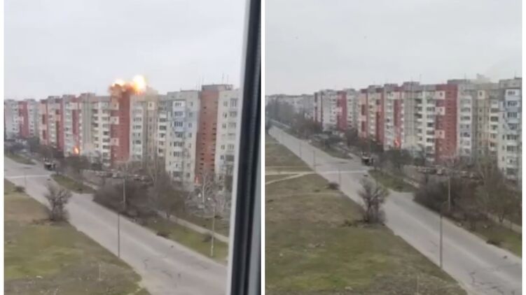 В Херсоне начались обстрелы, появилось видео стрельбы и судя по нему, в городе начались бои. Снаряд прилетел в многоэтажный жилой дом и разорвался на верхних этажах. Видео из дома напротив записывала женщина.