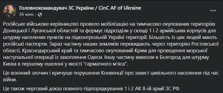 "Российское военное руководство провело мобилизацию на временно оккупированных территориях Донецкой и Луганской областей и формирует подразделения в составе 1 и 2 армейских корпусов для штурма населенных пунктов на подконтрольной Украине территории. Большинство из этих людей имеют российские паспорта. Сейчас часть наших земляков перебрасывают через территорию Ростовской области, Краснодарский край и временно оккупированного Крыма для проведения морской наступательной операции по захвату Одессы. Другую часть вывезли в Белгород для штурма Киева в первом эшелоне в качестве "пушечного мяса". Это военное преступление и вопиющее нарушение Конвенции о защите гражданского населения во время войны. Это также очередное доказательство полного подчинения 1 и 2 АК 8-й армии ВС РФ", - говорится в сообщении.