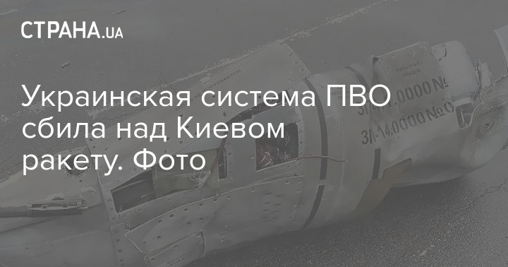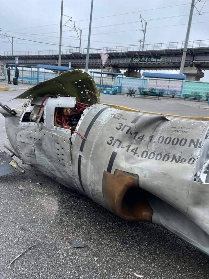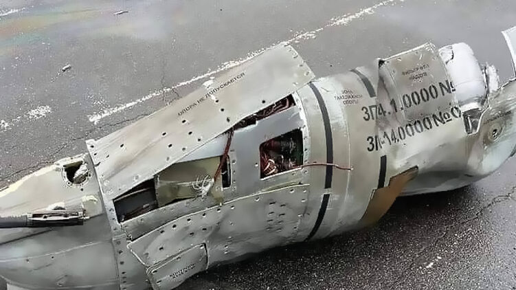 Украинская система противовоздушной обороны сбила над Киевом ракету 3П-14.1.0000 (номер неизвестен, из повреждений надпись видно не полностью).