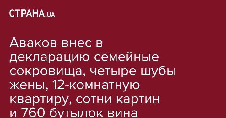 В совместной собственности Аваков указал мебель, антикварные зеркала, светильники, коллекцию бронзовых, чугунных, серебряных и каменных статуэток 19 - 20 вв., коллекцию серебряных и золотых монет, предоставленных Национальным банком Украины, библиотеку книг, печатных изданий, журналов 18 - 21 ст. ст. около 8000 экземпляров.