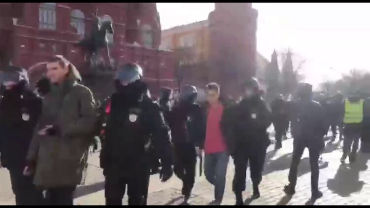 На Манежной площади в Москве сразу же начались задержания участников акции против войны в Украине.