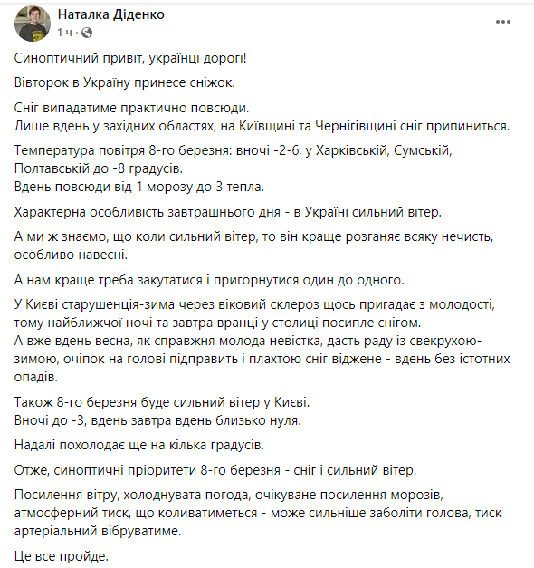 "Характерная особенность завтрашнего дня – в Украине сильный ветер. А ведь мы знаем, что если сильный ветер, то он лучше разгоняет всякую нечисть, особенно весной. А нам лучше нужно укутаться и прильнуть друг к другу", - пишет синоптик.