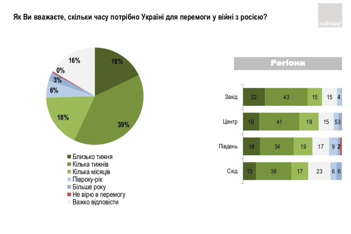 • 57% считают, что Украина сможет победить в войне с Россией уже в ближайшие недели;