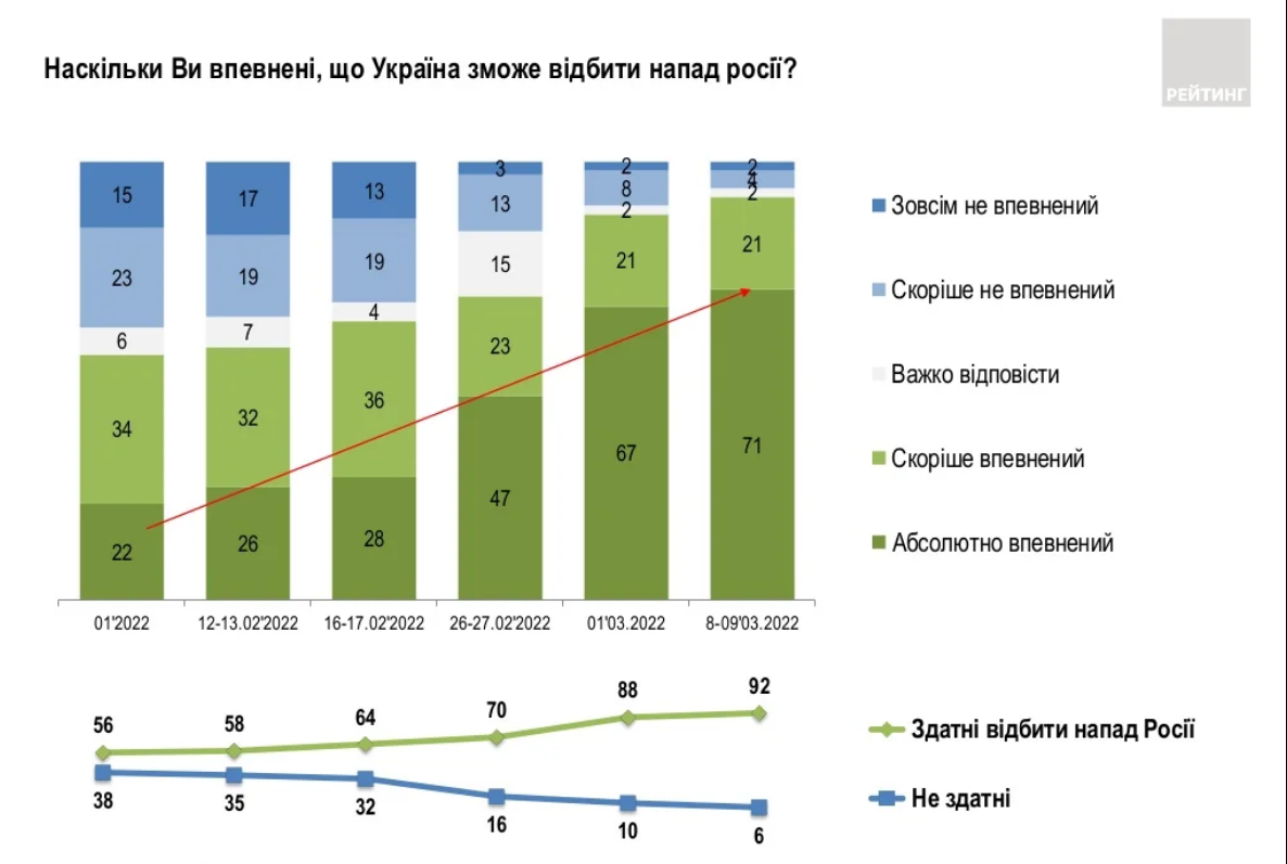 Среди жителей Украины 92% верят в то, что их страна сможет отразить нынешнее нападение Российской Федерации. С каждым днем этот показатель все больше растет.