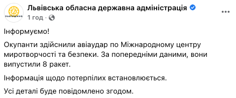 "Информируем! Оккупанты совершили авиаудар по Международному центру миротворчества и безопасности. По предварительным данным, они выпустили 8 ракет. Информация о пострадавших устанавливается", - говорится в сообщении.