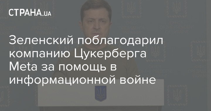 "Война - не только военное противостояние на украинской земле. Это еще и ожесточенное сражение в информационном пространстве. Хочу поблагодарить @Meta и ряд других платформ, имеющих активную позицию, которые помогают и стали бок о бок с украинцами", - говорится в микроблоге Владимира Зеленского в Тwitter.